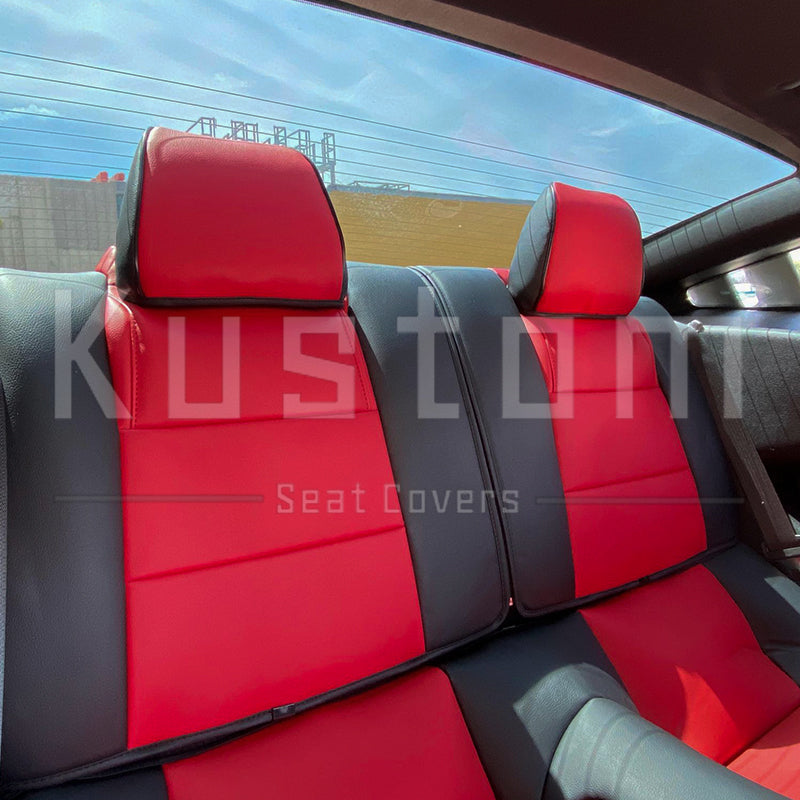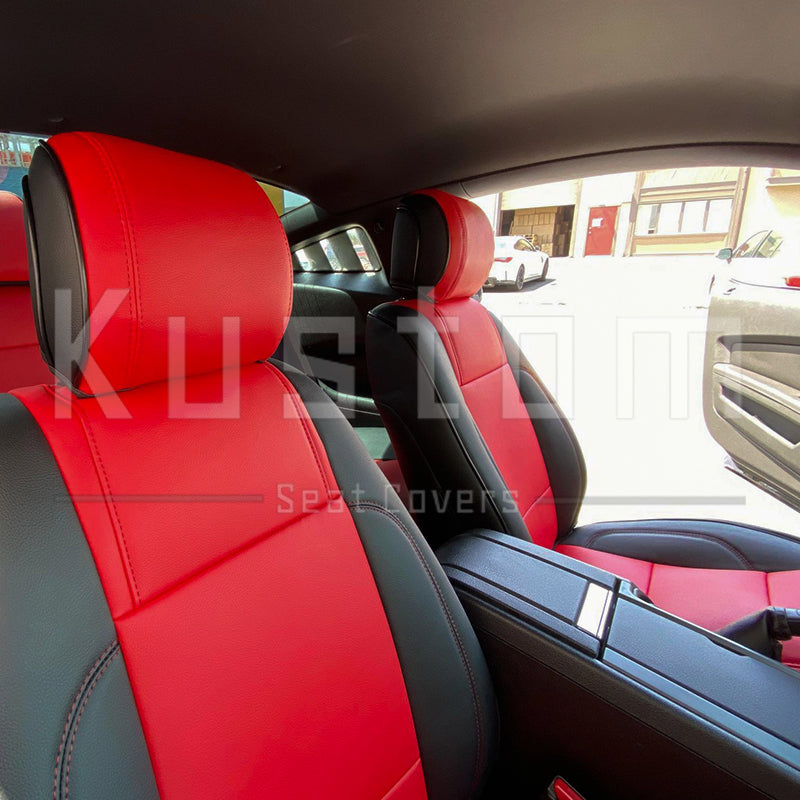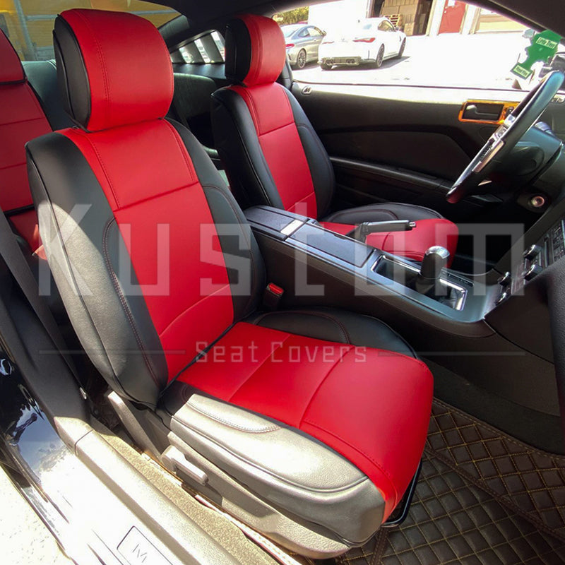 Upgrade your Ford Mustang's seats with these luxurious, sporty leather seat covers from Kustom Interior™. Choose from a variety of color options for this artificial leather to complement your car's leather interior design or exterior paint job. With a 100 percent fit guarantee, you can rest assured that these Ford Mustang seat covers will work perfectly and look fantastic. The surface is waterproof and delightfully soft to the touch, protecting your factory upholstery leather seats from damage while also enhancing your comfort.