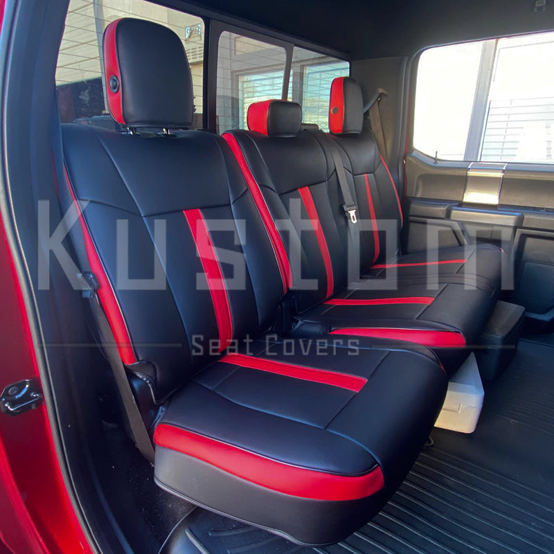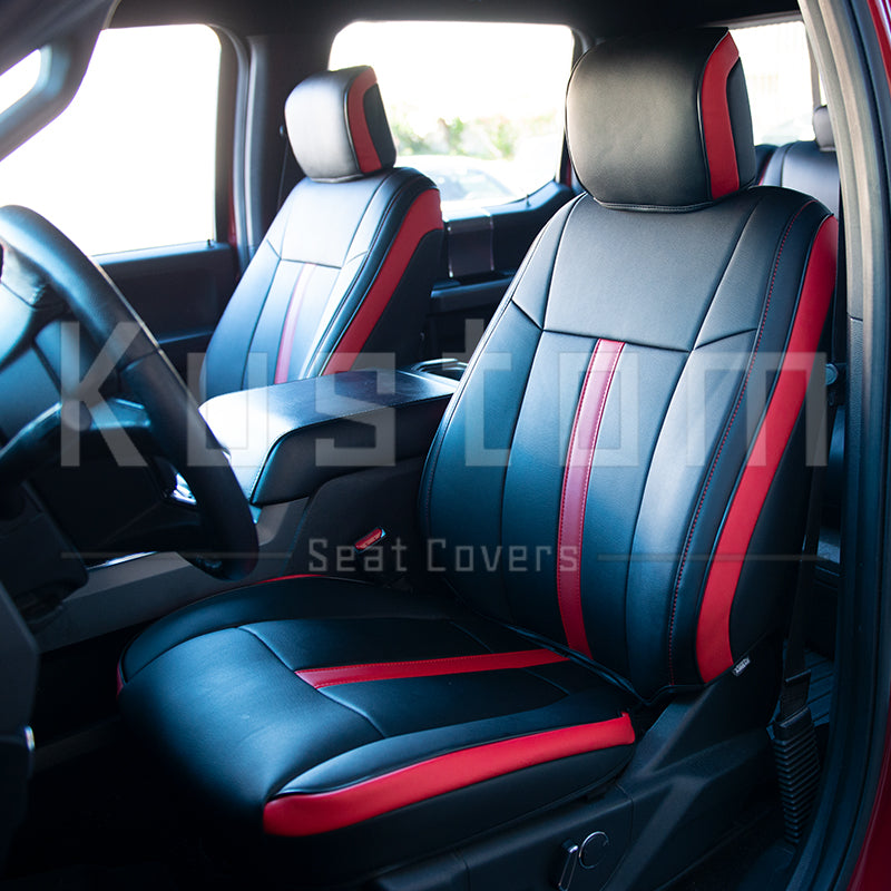 Upgrade your Ford F150 's seats with these luxurious, sporty leather seat covers from Kustom Interior™. Choose from a variety of color options for this artificial leather to complement your car's leather interior design or exterior paint job. With a 100% fitment guarantee, you can rest assured that these Ford F150 seat covers will work perfectly and look fantastic. The surface is waterproof and delightfully soft to the touch, protecting your factory upholstery leather seats from damage while also enhancing your comfort.