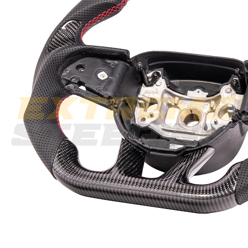 The EXTREME-STEERING™ Dodge Challenger Carbon Fiber Steering Wheel is a high-performance, luxury upgrade for the Dodge Challenger. Made from lightweight, durable carbon fiber, this steering wheel enhances the car's sporty aesthetic and offers superior handling and control. The design typically includes ergonomic grips and premium stitching, providing a blend of style, comfort, and functionality for an enhanced driving experience.
