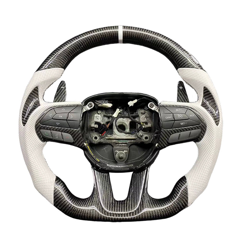 The EXTREME-STEERING™ Dodge Challenger Carbon Fiber Steering Wheel is a high-performance, luxury upgrade for the Dodge Challenger. Made from lightweight, durable carbon fiber, this steering wheel enhances the car's sporty aesthetic and offers superior handling and control. The design typically includes ergonomic grips and premium stitching, providing a blend of style, comfort, and functionality for an enhanced driving experience.