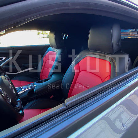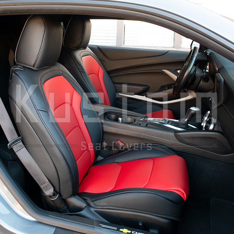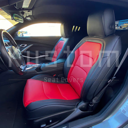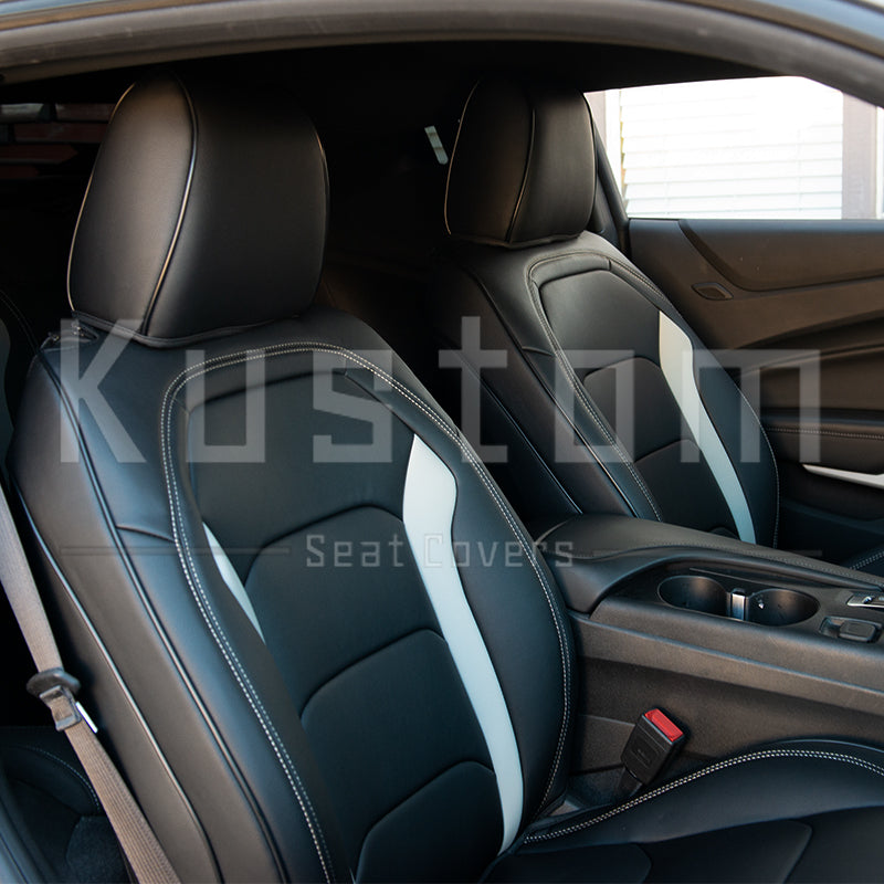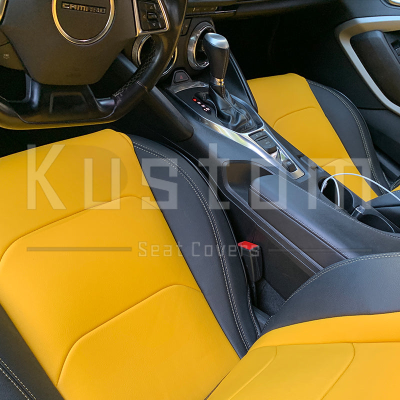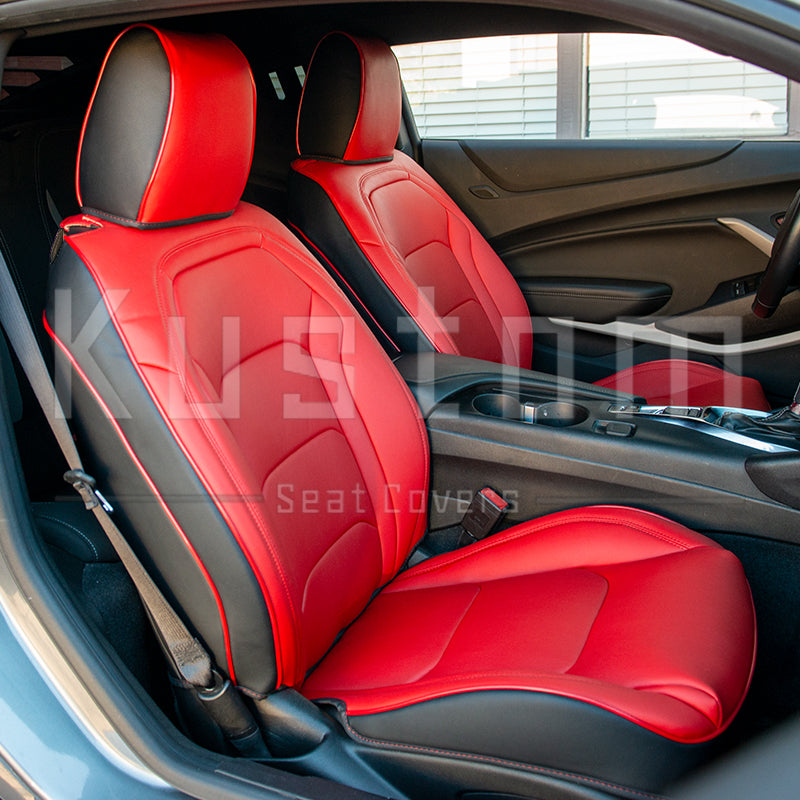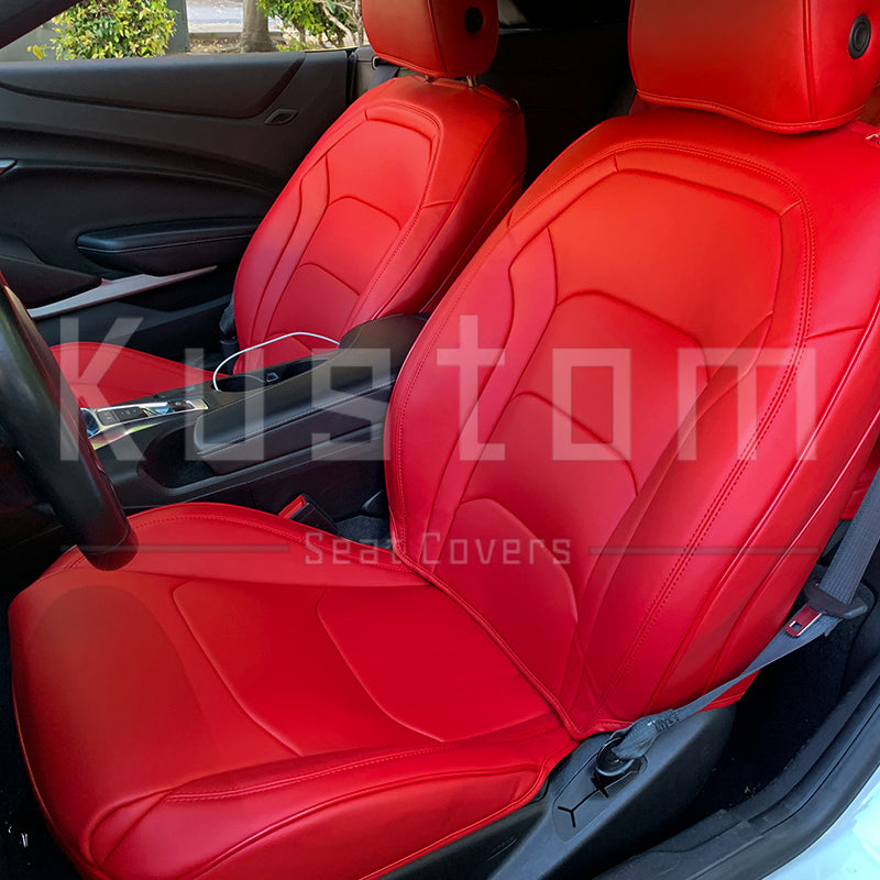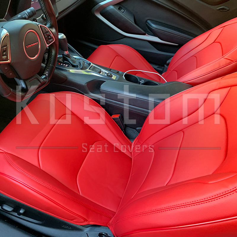 Upgrade your 6th Gen Camaro's seats with these luxurious, sporty leather seat covers from Kustom Interior™. Choose from a variety of color options for this artificial leather to complement your car's leather interior design or exterior paint job.