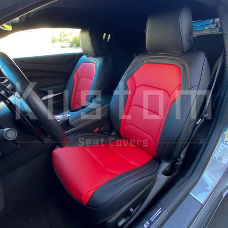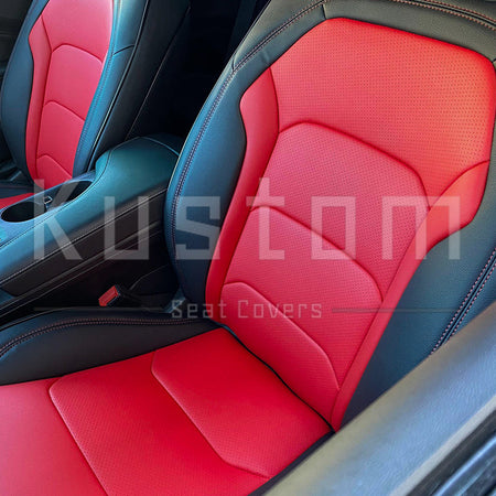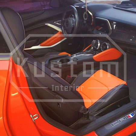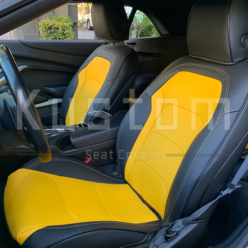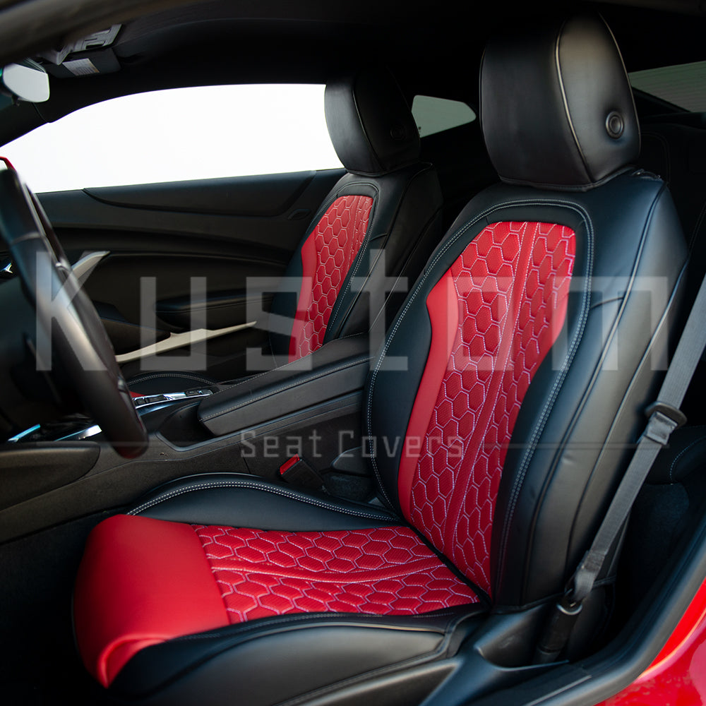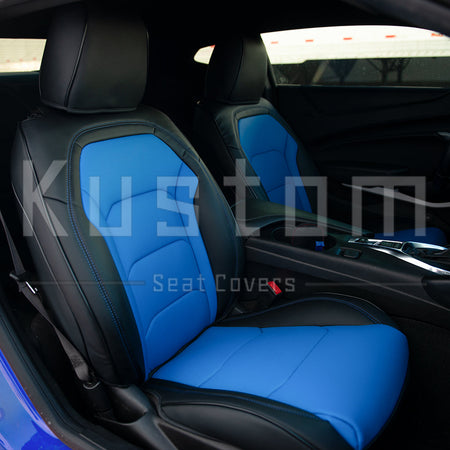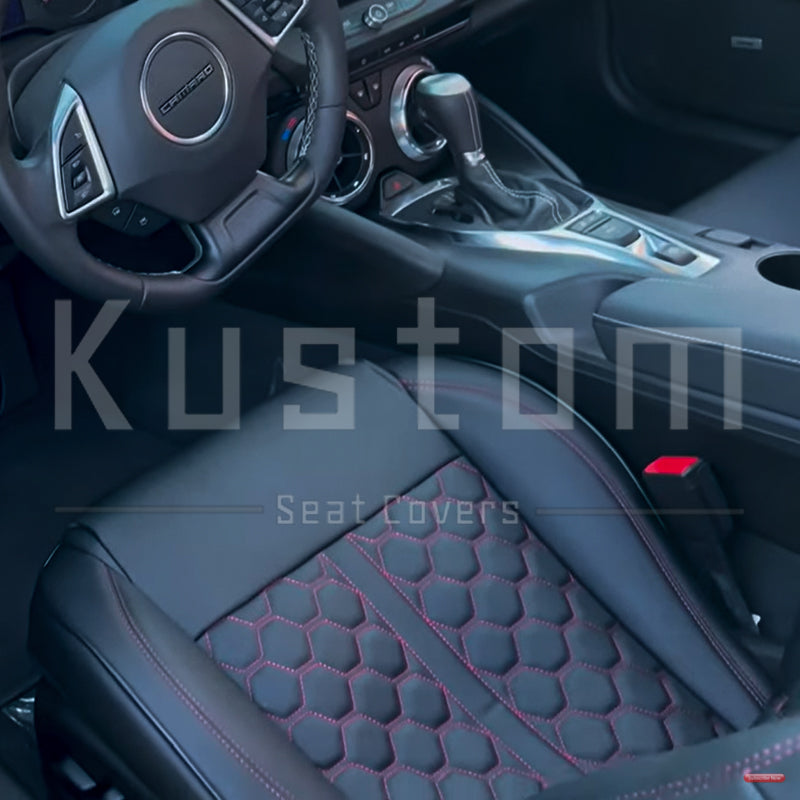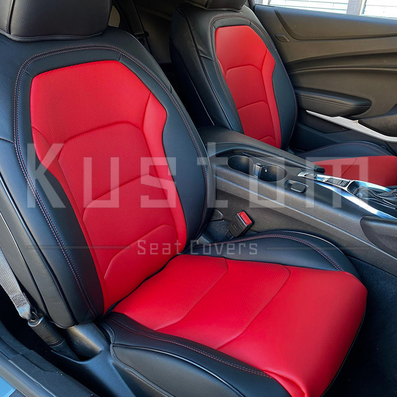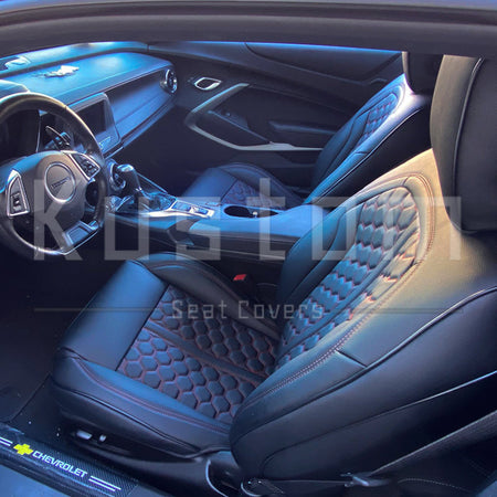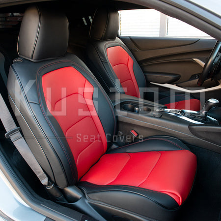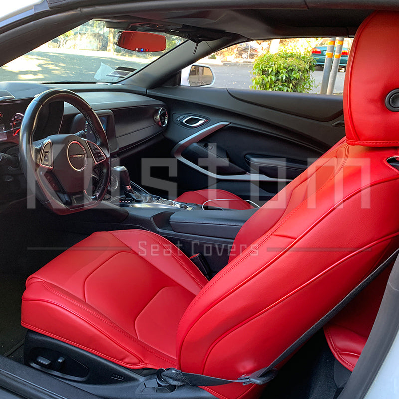 Upgrade your 6th Gen Camaro's seats with these luxurious, sporty leather seat covers from Kustom Interior™. Choose from a variety of color options for this artificial leather to complement your car's leather interior design or exterior paint job.
