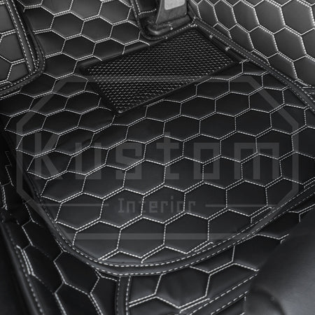 Fashioned from premium, durable leather, the custom honeycomb pattern is not only visually striking but also serves a practical purpose. It provides a robust barrier against daily wear, capturing dirt, debris, and spills to keep your Supra ’s interior in pristine condition.
