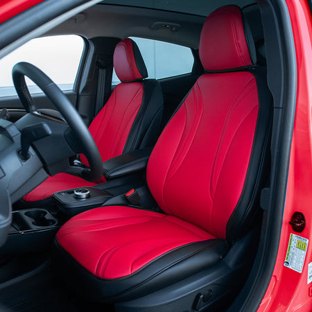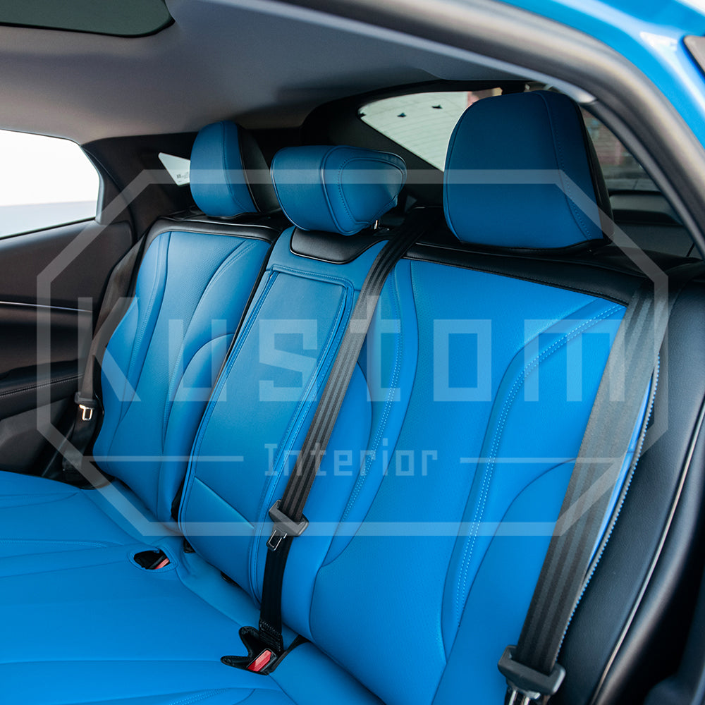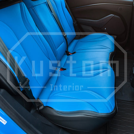 Upgrade your Ford Mustang Mach-E's seats with these luxurious, sporty leather seat covers from Kustom Interior™. Choose from a variety of color options for this artificial leather to complement your car's leather interior design or exterior paint job. With a 100% fitment guarantee, you can rest assured that these Ford Mustang Mach-E seat covers will work perfectly and look fantastic. The surface is waterproof and delightfully soft to the touch, protecting your factory upholstery leather seats from damage while also enhancing your comfort.