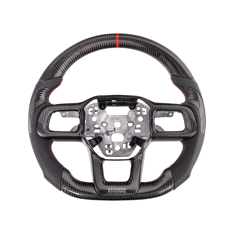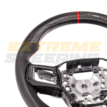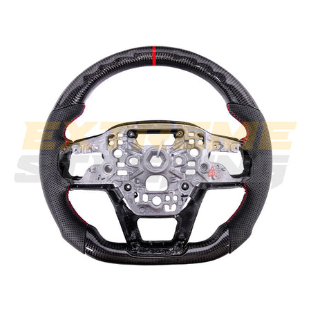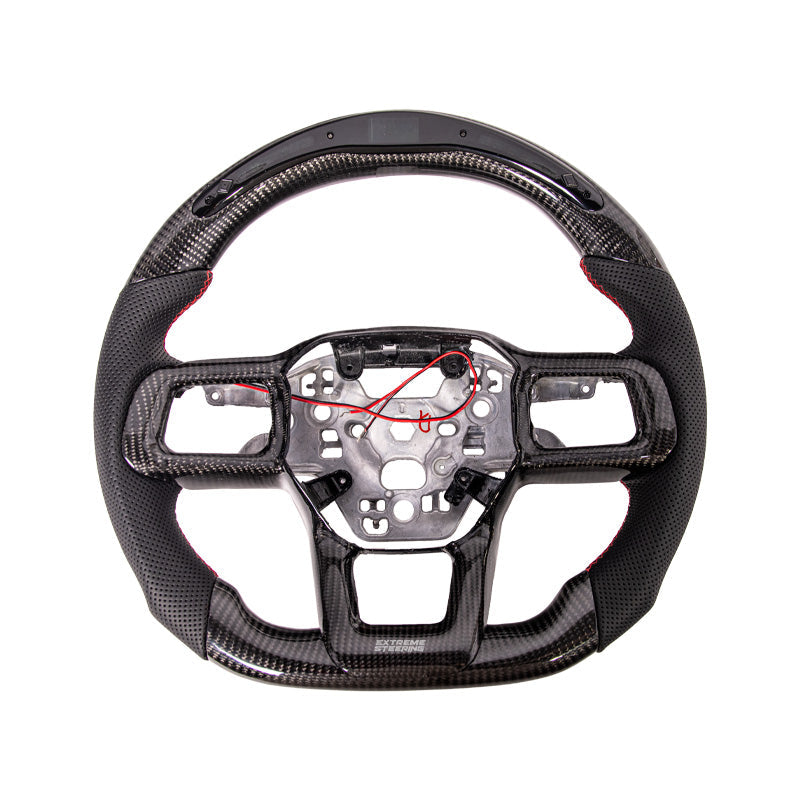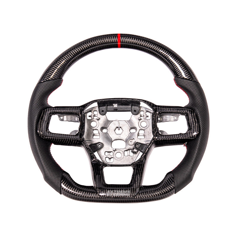 The EXTREME-STEERING™ Ford Mustang Carbon Fiber Steering Wheel is a high-performance, luxury upgrade for the Ford Mustang. Made from lightweight, durable carbon fiber, this steering wheel enhances the car's sporty aesthetic and offers superior handling and control. The design typically includes ergonomic grips and premium stitching, providing a blend of style, comfort, and functionality for an enhanced driving experience.