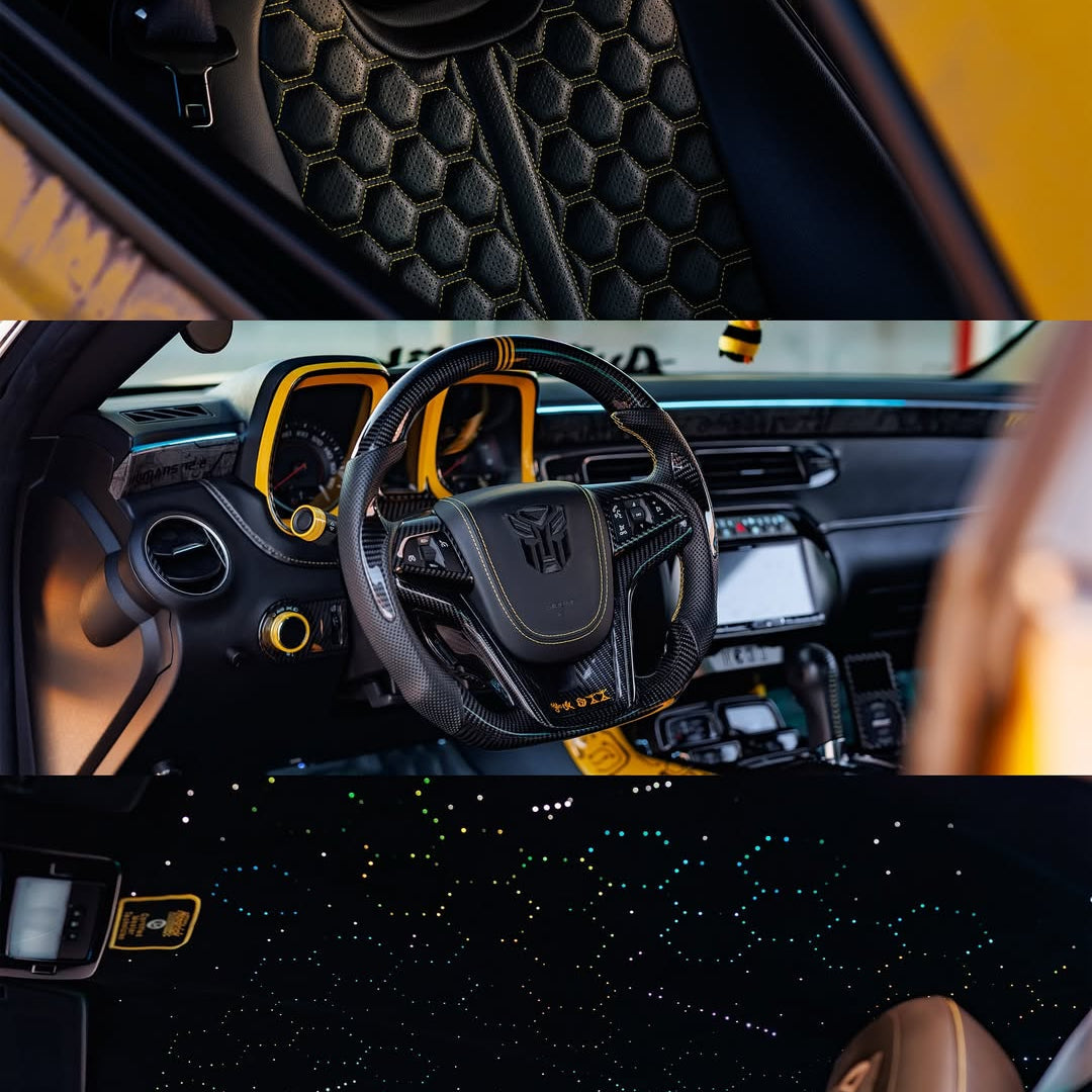 The carbon fiber construction not only reduces weight but also adds a sleek, sporty aesthetic that complements the Camaro's interior design. This steering wheel typically features ergonomic grips, ensuring maximum comfort and control during high-performance driving. The meticulous attention to detail is evident in the premium stitching, which enhances both durability and visual appeal.