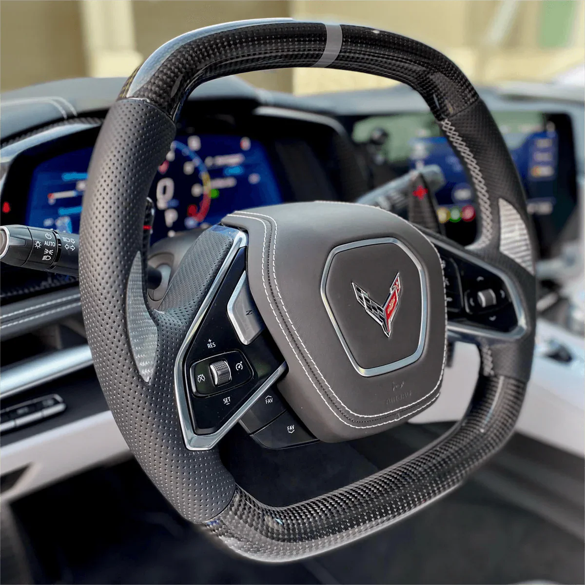 The carbon fiber construction not only reduces weight but also adds a sleek, sporty aesthetic that complements the Corvette's interior design. This steering wheel typically features ergonomic grips, ensuring maximum comfort and control during high-performance driving. The meticulous attention to detail is evident in the premium stitching, which enhances both durability and visual appeal.