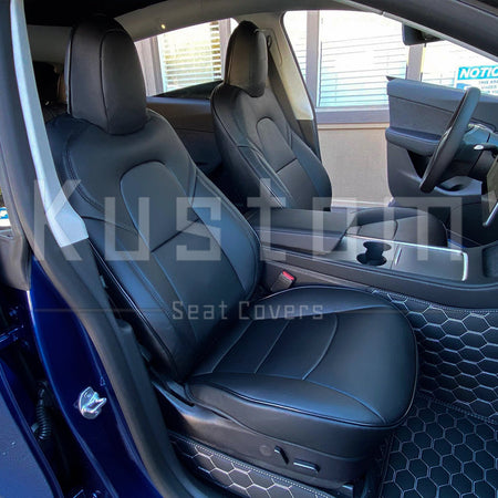 Upgrade your Tesla Model Y 's seats with these luxurious, sporty leather seat covers from Kustom Interior™. Choose from a variety of color options for this artificial leather to complement your car's leather interior design or exterior paint job. With a 100% fitment guarantee, you can rest assured that these Tesla Model Y seat covers will work perfectly and look fantastic. The surface is waterproof and delightfully soft to the touch, protecting your factory upholstery leather seats from damage while also enhancing your comfort.